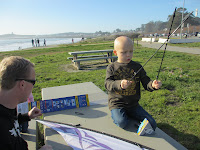 It feels like summer - the temperature might be barely 70, but the sunshine is enough for us to want to be outdoors... Badly! Our options are limited with the port accessed, we don't want Adam to compromise his line. It was actually Adam's idea to fly his new kite. There is, of course, no wind anywhere, so we went on a hunt for wind. We started in San Ramon/Dublin, but no luck. Our next idea was by the bay and headed over the San Mateo bridge. There were sailboats, so we had hope. However, on the other side of the bridge, there is not one branch swaying, so we decide to go farther west. We end up in Half Moon Bay, and not even a breeze. Really? We stopped in Moss Beach where there is a serious crowd of surfers and spectators, and come to find out, there are two kites flying by the beach. Yes! We get the never-been-opened kite out, and Josh begins assembly while Rachel and I watch some surfers. Ten minutes later, Adam is using the kite rods as samurai swords and the kite is not looking like a kite. By the time we figured the thing out, the other kites were landed. There was not even enough wind by the ocean to get this thing in the air. Hilarious! So, we went to the beach. Adam drew in the sand while Rachel wanted to get her feet wet. I froze my toes with her, but totally worth it.
